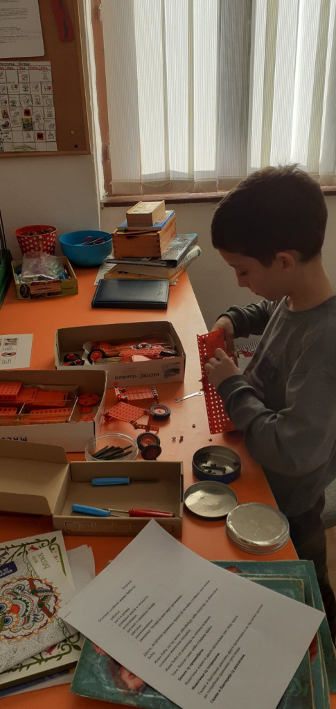 сунђерастим елементима (геометријска тела), мозаик крупне боцкалице, конструкторски сет (металне плочице са матицама и