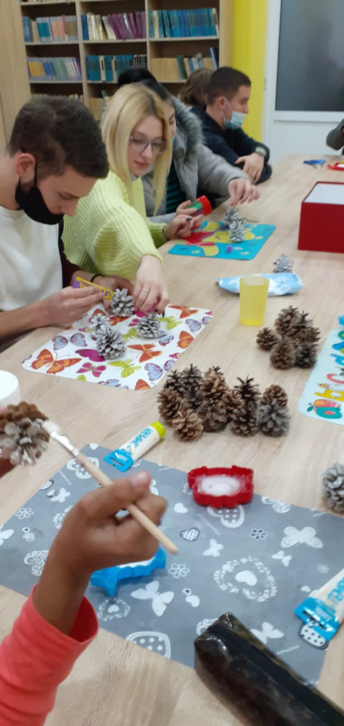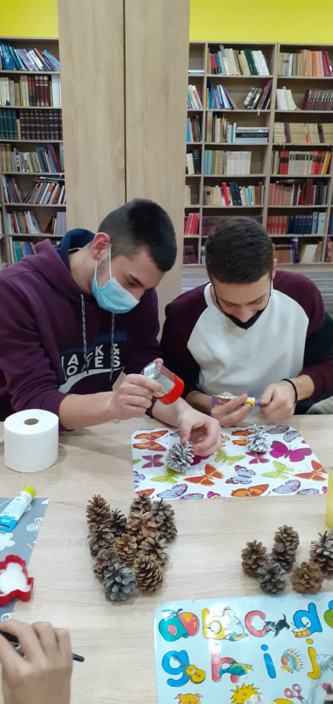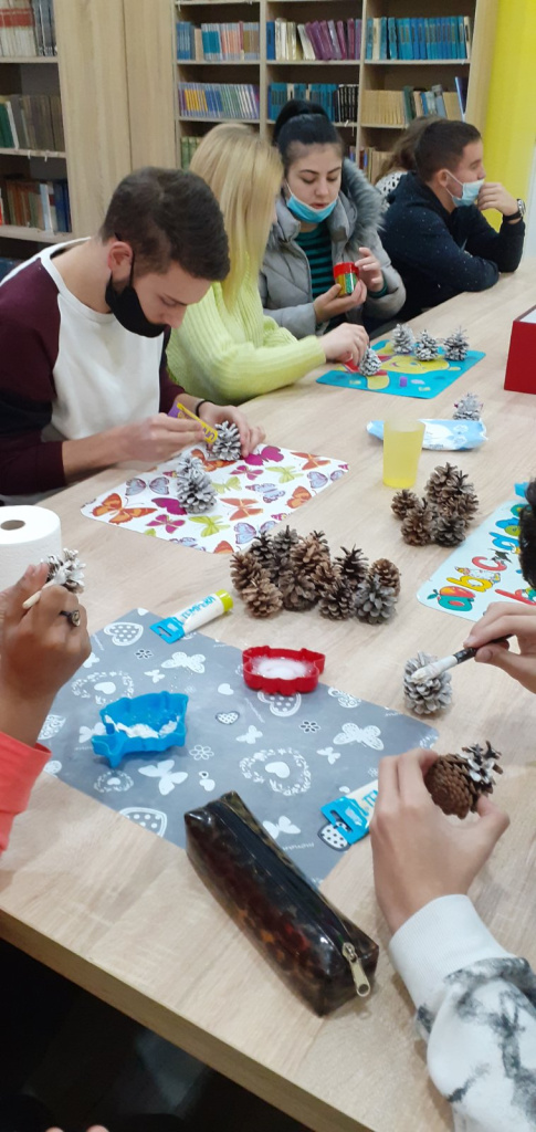 прионуле су вредне руке на израду украса. Једна група ученика бојала је шишарке белом