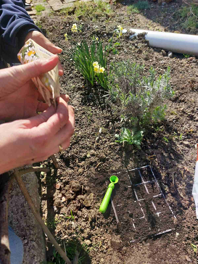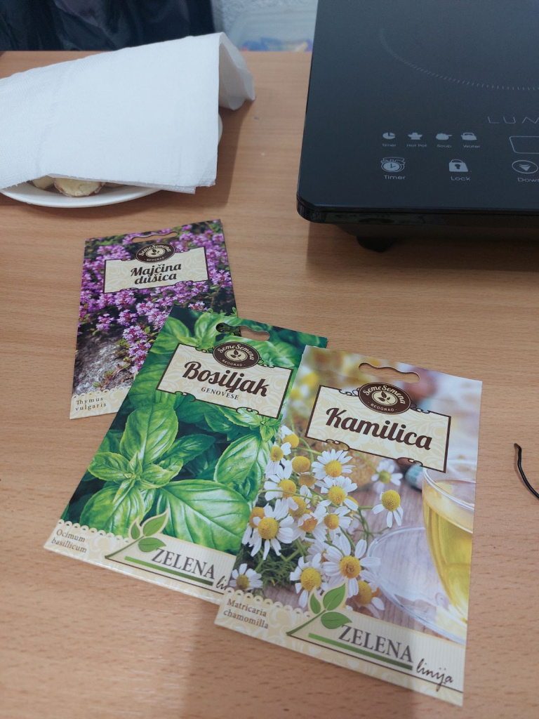 земљу-хумус, семе камилице, мајчине душице и босиљка и баштенски алат.