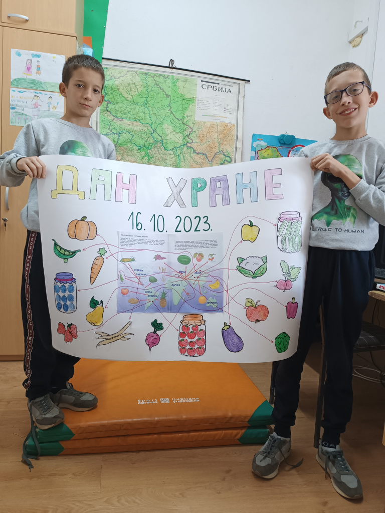 У СКЛОПУ НАСТАВЕ ЛИКОВНЕ КУЛТУРЕ, ГЕОГРАФИЈЕ,ДОМАЋИНСТВА И ИНФОРМАТИКЕ, 05.10. ЗАПОЧИЊЕМО АКТИВНОСТ СА ЦИЉЕМ ОБЈЕДИЊАВАЊА ЗНАЊА И ВЕШТИНА ИЗ НАВЕДЕНИХ ПРЕДМЕТА. УЧЕНИЦИ ВИШИХ РАЗРЕДА СУ У ОКВИРУ ДЕЧЈЕ НЕДЕЉЕ ИЗРАДИЛИ ПЛАКАТ ПОСВЕЋЕН  МЕЂУНАРОДНОМ ДАНУ ХРАНЕ ( 16.10. )