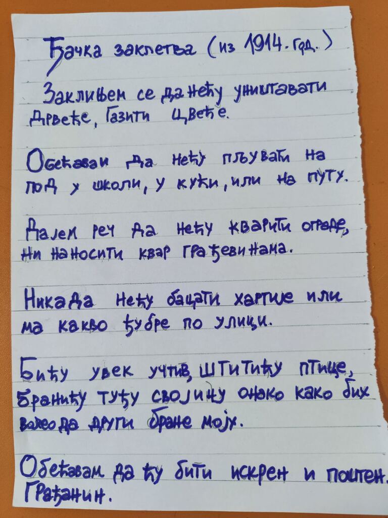 исписивањем ђачке заклетве из 1914. и то писаним словима ћирилице као и стихове “Ала је леп